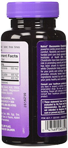Studio : Natrol Publisher : Natrol Binding : Health and Beauty Product Description Naturally found in the body, Glucosamine and Chondroitin are natural building blocks for connective tissue that have been studied extensively by the National Institutes of Health for their role in regenerating cartilage and lubricating joints. Natrol Glucosamine and Chondroitin blends these two powerful joint health ingredients into a formula designed to keep your joints healthy -- and comfortable. Easy-swallow smaller tablets. Clinically tested levels. Made in the USA! 0