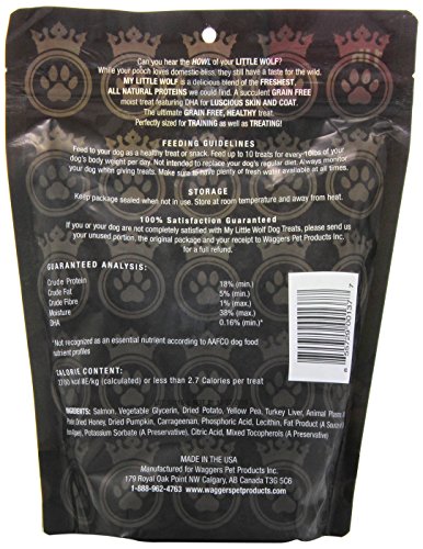 -. Binding : Misc. -. Brand : Waggers -. EAN : 0855729001377 -. Feature : Soft & moist dog treats ideal for small rewarding / Grain free and less than 2.7 calories per treat for rewarding with less guilt / Over 40% fresh protein for guaranteed great taste -. Label : Waggers -. Manufacturer : Waggers -. Model : My Little Wolf Salmon 16 OZ -. MPN : My Little Wolf Salmon 16 OZ -. PackageQuantity : 1 -. PartNumber : My Little Wolf Salmon 16 OZ -. ProductGroup : Pet Products -. ProductTypeName : PET_SUPPLIES -. Publisher : Waggers -. Size : Small -. Studio : Waggers -. Title : Waggers Soft and Moist Grain Free Salmon Recipe Dog Treats, 16-Ounce -. UPC : 855729001377