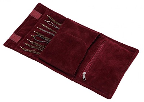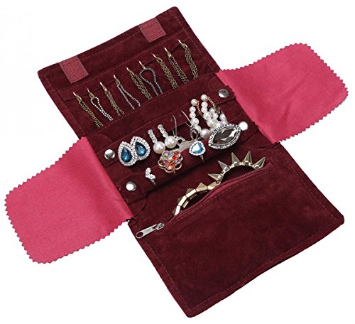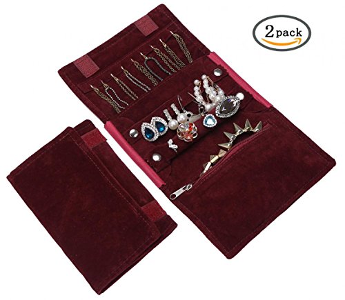 Features: - Soft and luxurious velvet jewelry roll - Small packing size to put in the handbag or carry on luggage - 9 hooks for chains - Removable earring strap - Removable ring bar - Side cloth flap to protect rings and earrings from scratched - One zipper bottom pocket - Velcro closure and small foldable size - Luxurious yet affordable - Bags only, other things are not included.