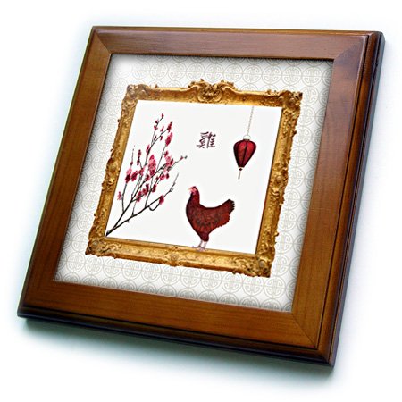 3D Rose Red Lantern and Plum Tree in Gold Frame-Sign of the Rooster Tile, 8" x 8"