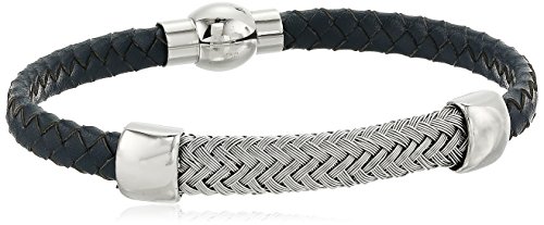 Men's Navy Blue Genuine Leather Braided with Stainless Steel Wire Accent Bracelet, 8.5"x 0.3"