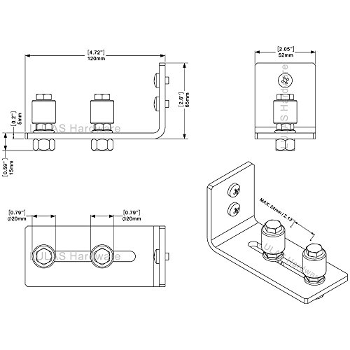 ADJUSTABLE- Adjustability function to ensure guide works with all sliding doors,Arm Thickness: 5 mm, length: 4.72 in, height: 5.26in, wide: 2.05, fit all barn and sliding doors up to 2.13 inches in thickness.