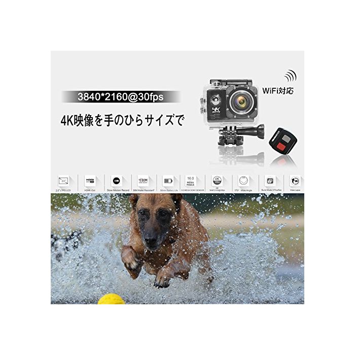 ■2인치LCD디스플레이 4배 줌170도 광각 렌즈 탑재 스포츠 카메라 ■30M까지의 방수 케이스 첨부 오고 수중 에서의 촬영을 서포트 합니다 ■4K / 풀HD등의 고해상도 에서의 촬영이 가능 ■찍은 동영상은 WiFi/USB를 사용해 PC등으로 전송에 옵니다 ■마린 스포츠X게임 등 하드한 장면에서도 활약합니다