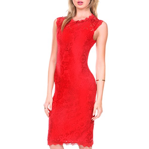 LOOK LOVELY IN LACE: From the high neckline to the knee length hem, our shapely sheath features a fully lined, all over lace design, accented by scalloped edges to exude femininity. Constructed from 100% polyester, our flirty lace party dress offers you a flexible fit that caresses your curves without having to worry about the puckering of a zipper. Our cocktail dress is sure to wow your audience, and is so comfortable you'll want to wear it day and night.