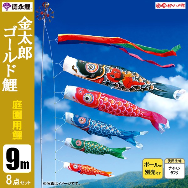 こいのぼり/鯉のぼり 庭園用(ポールは別売りになります)(こちらの商品は家紋・名前入れはできません。ご了承ください。)鯉のぼり 室内用 鯉のぼり ポール 鯉のぼり マンション 鯉のぼり 庭 園用 鯉のぼり 手作り 久月鯉のぼり 鯉のぼり ポール 鯉のぼり 徳永 取扱(セット内容)・吹流し9m・黒鯉9m・赤鯉8m・青鯉7m・緑鯉6m・橙鯉5m・矢車一式・ロープ40m金太郎ゴールド鯉 鱗に金粉で黄金鶴柄を配したまさにゴールド鯉。両面にたくましい金太郎を描いた金太郎ゴールド鯉です。吹流しには魔除けの意味をもつ五色を用いた五色吹流しをセットしています。