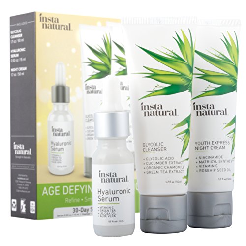 -. Feature : AGE DEFYING INGREDIENTS - At InstaNatural, we believe that addressing aging concerns requires a unique combination of the most effective actives, and infusing them with natural ingredients that are known to provide powerful benefits in the skin. Our Age Defying Trio combines a blend of Glycolic Acid, Hyaluronic Acid, Vitamin C and peptides to deliver anti-aging results in a synergistic routine that is gentle, safe and effective. The result is skin that appears more firm, smooth and radiant. / EXFOLIATING SKIN CLEANSER - InstaNatural's Glycolic Cleanser effectively sloughs away dulling skin cells and dissolve clogged pores. Enhanced with natural extracts such as Lemon, Apple, Sugar Cane and Willow Bark, this facewash tones the appearance of pores, age spots, and skin-firming Arginine supports healthy collagen production. The benefit is a formula that fights acne and the appearance of fine lines and wrinkles, while also reducing discoloration for the ultimate beauty benefit. / INTENSE MOISTURE & HYDRATION - While Hyaluronic Acid provides unmatched moisture, InstaNatural's Hyaluronic Acid Serum is also infused with ingredients to aid in all your anti aging needs to diminish the appearance of wrinkles, fine lines, and discoloration on the face. With additional antioxidant support from Vitamins C and E, Green Tea and Jojoba Oil, you'll see the active renewing changes to your skin in no time with this easy addition to your skincare routine. / AS SEEN IN SHAPE MAGAZINE - InstaNatural's skin-refining Night Cream was featured in Shape Magazine as one of the best nighttime skin creams around. Powerful peptide Matrixyl Synthe'6 is combined with Vitamin C, Niacinamide and natural oils like Organic Rosehip, Avocado and Argan Oil to firm, nourish and hydrate the skin. This concentrated formula was designed to deliver extra moisture and nourishment to all skin types, leaving your complexion smoother, brighter and more radiant. / THE PERFECT PRESENT THIS HOLIDAY SEASON - Popular Black Friday & Cyber Monday Sale - Unique gift giving ideas for Christmas, Hanukkah and Kwanzaa - Top deals on last minute gifts - One-of-a-kind stocking stuffer gift set for family and friends.