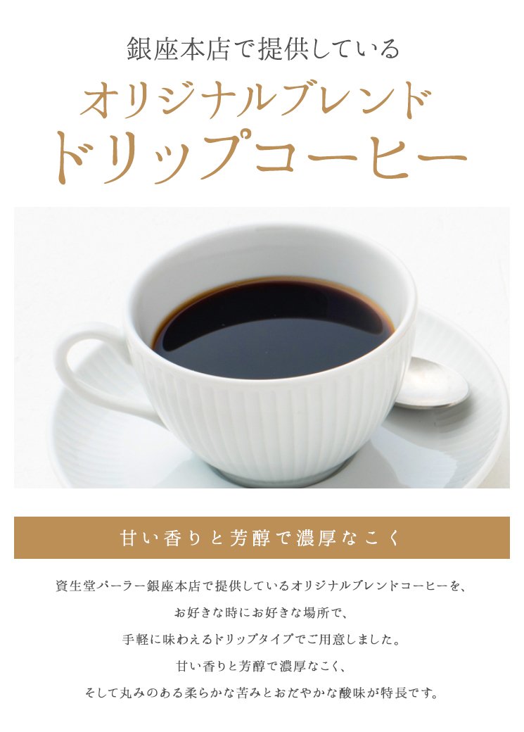 資生堂パーラー銀座本店で提供しているオリジナルブレンドコーヒーを、お好きな時にお好きな場所で、手軽に味わえるドリップタイプでご用意しました。甘い香りと芳醇で濃厚なこく、そして丸みのある柔らかな苦みとおだやかな酸味が特長です。