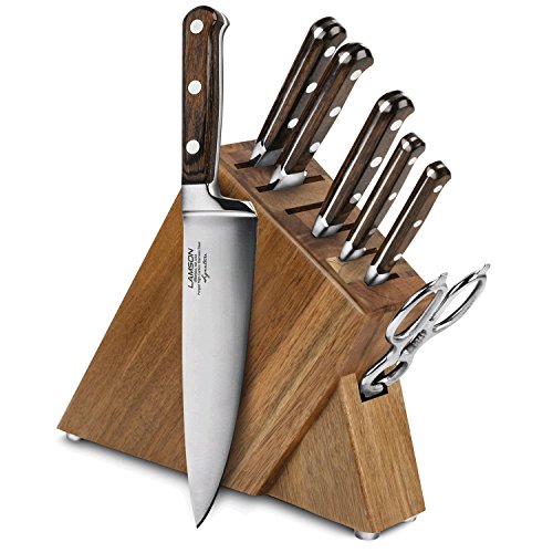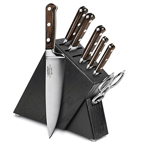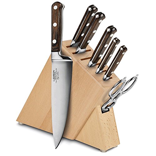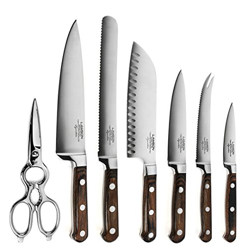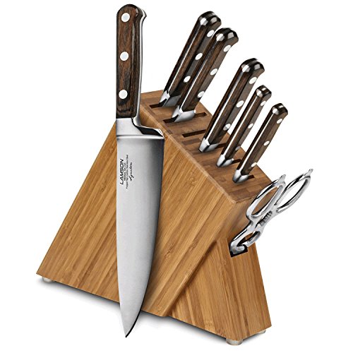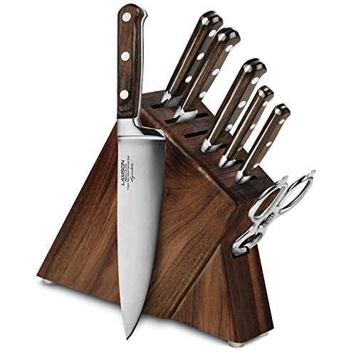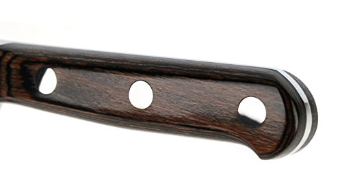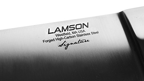 Studio : Lamson Publisher : Lamson Product Description Each Lamson Signature knife is precision forged resulting in a harder, sharper blade that is corrosion resistant. The curved and recessed bolster provides a seamless transition from handle to blade and supports your thumb for better balance and safety. The triple riveted resin-infused pakkawood handle with nickel silver rivets provide a comfortable grip. Descendants from founding craftsman still hand assemble and finish each knife, including the final edging process individually ensuring that the blade's edge is at the optimal cutting angle for maximum sharpness. 0