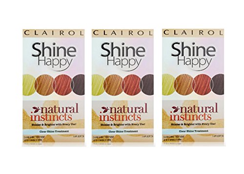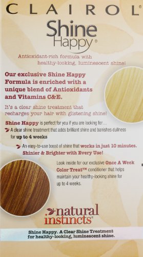 -. Binding : Health and Beauty -. Brand : Clairol -. Color : Clear -. EAN : 0885609278339 -. Feature : Non-permanent color / Provides 4 weeks of shine / Adds healthy-looking luster to most types and colors of hair* (*not recommended for gray hair) / Includes weekly conditioning treatment to help seal in the shine / Works in just 10 minutes / Adds healthy-looking luster to most types and colors of hair* (*not recommended for gray hair) / Includes weekly conditioning treatment to help seal in the shine / Works in just 10 minutes -. Label : Clairol -. Manufacturer : Clairol -. Model : NA -. MPN : 00381519017322 -. NumberOfItems : 3 -. PackageQuantity : 3 -. PartNumber : 00381519017322 -. ProductGroup : Beauty -. ProductTypeName : BEAUTY -. Publisher : Clairol -. ReleaseDate : 2009-12-28 -. SKU : 951863(3) -. Studio : Clairol -. Title : Clairol Natural Instincts Hair Color Shine Happy 00 Clear Shine Treatment 1 Kit (Pack of 3) -. UPC : 787543882330