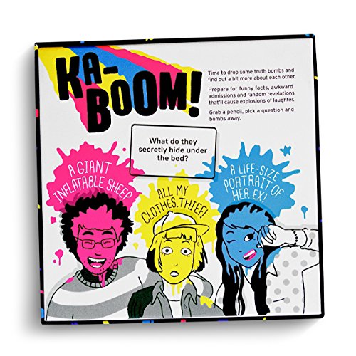 Studio : BANANAGRAMS Publisher : BANANAGRAMS Binding : Toy Product Description Ka-Boom! Gather your friends and get ready - it's time to drop some truth bombs. Answer questions about each other and prepare for funny facts, awkward admissions and random revelations that'll cause explosions of laughter. Gab a pencil, pick a question and bombs away! 0