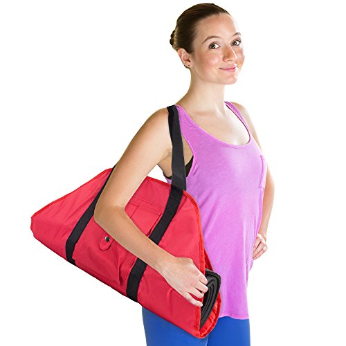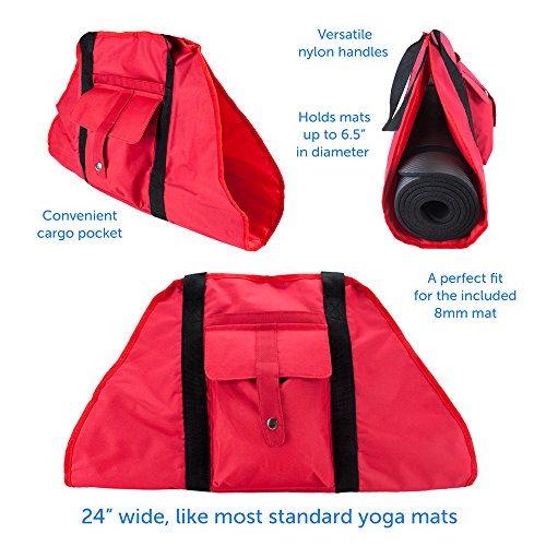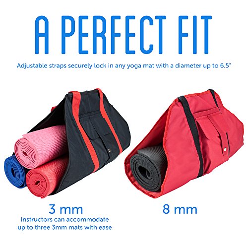 [Description] Adjustable straps securely lock in any yoga mat with a diameter up to 6.5``. That``s a perfect fit for any 8mm mat_ or for up to three 3mm mats! Handy cargo pocket stores your phone_ wallet_ bottles of water_ gloves or socks-anything you need to need to keep stored at the studio or on the go Long lasting_ lightweight nylon canvas is easy to clean and maintain Versatile nylon handles can be carried by hand or slung over the shoulder Hangs flat or folds down nearly flat for easy storage when not in use