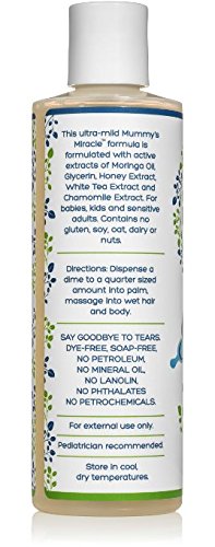 Studio : Mummy's Miracle Publisher : Mummy's Miracle Binding : Health and Beauty Product Description Mummy's Miracle Moringa Baby Wash and Shampoo is for baby's hair and body. This ultra-mild Mummy's MiracleTM formula is tear-free and formulated with active extracts of Moringa Oil, Glycerin, Honey Extract, White Tea Extract and Chamomile Extract. For babies, kids and sensitive adults. Contains no gluten, soy, oat, dairy or nuts. Natural Moringa formula, Tear-free. Gentle cleansing for hair and body. Pour onto a wet washcloth or hand and apply to hair and body, or pour directly into bath water. Pediatrician recommended. OUR STORY Mummy's Miracle came about six years ago when I turned a grim diagnosis into a health revolution. The revolution was based on Moringa, one of the medicinal herbs my parents sent me to help me when conventional treatments left me weak and unable to focus. I drank the juice and chewed the seed of the Moringa plant and soon discovered the seed contained potent oil that was nourishing on the skin. I soon combined this oil with other essential oils I used at the time. The result was a 'miracle.' At the time, I had two children and pregnant for the third. I used my mixture on my kids as well. I soon noticed they never had the rashes and eczema that many of the other babies and kids had. So, I created an eco-friendly baby skin care line of products using Moringa's miraculous oil. I called my potion Mummy's Miracle. It features all-natural, toxin-free products, including baby oil, lotion, butter, medicated powder, baby powder, vapor rub, tear-free wash and shampoo, diaper ointment, nipple balm for nursing mothers, and stretch mark oil for pregnant moms and best of all it smells great. 0