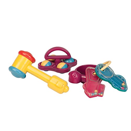 Childhood is magical. Five fun toys to delight babys senses. Colorful beads rattle in the keys. Mallet head turns and clicks. Rolling rattle makes balls spin. Turtles stack and float. All BPA free and safe for curious mouths