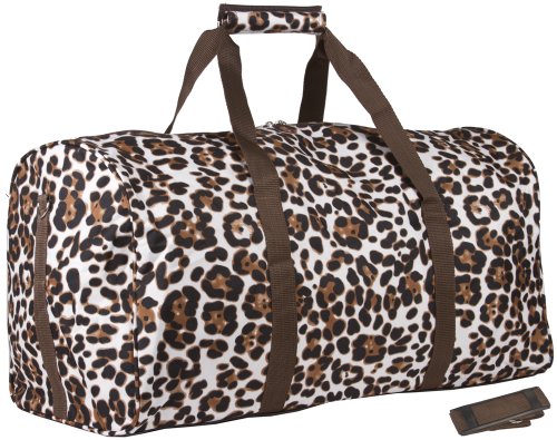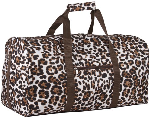 -. Brand : World Traveler -. Color : Animal Print - Brown -. Department : womens -. EAN : 0702472382096 -. Feature : 2 Side Bag Zipper Compartments / Main zippered top enclosure to gain entrance into bag / Adjustable Shoulder Strap / Carry Handles With Snaps / Material: Microfiber -. PackageQuantity : 1 -. ProductGroup : Apparel -. ProductTypeName : LAGE -. Size : Large -. Title : Brown Animal Print Duffle Carrying Bag 21" Large -. UPC : 702472382096