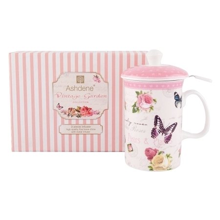 -. Title : Ashdene Vintage Garden Three-Piece Fine Bone China Tea Mug Set with Infuser & Lid