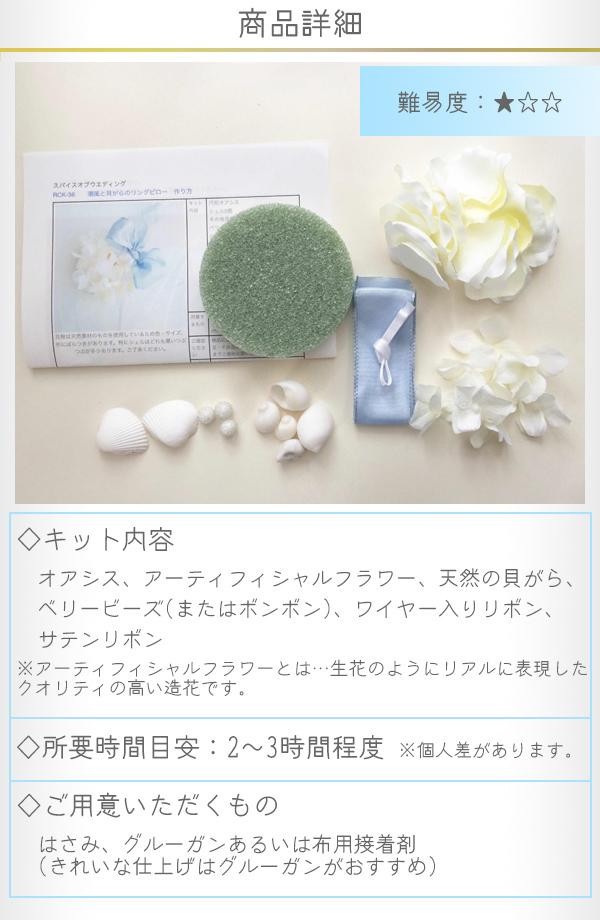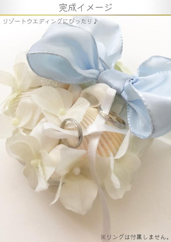 ウエディング小物作家がデザインするナチュラルで大人可愛いリングピローの手作りキットです。糸針を使わず、グルーガンや布用接着剤で、貼り付けていくだけ♪天然の貝がらと、アーティシャルフラワー、「サムシングブルー」のリボンでアレンジしました。海、ブルー、夏、ハワイ、グアムなどのリゾートウエディングにオススメなウエディングアイテムです。 |