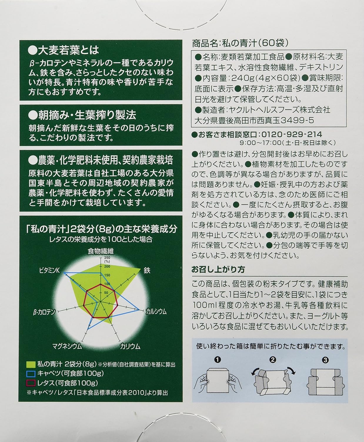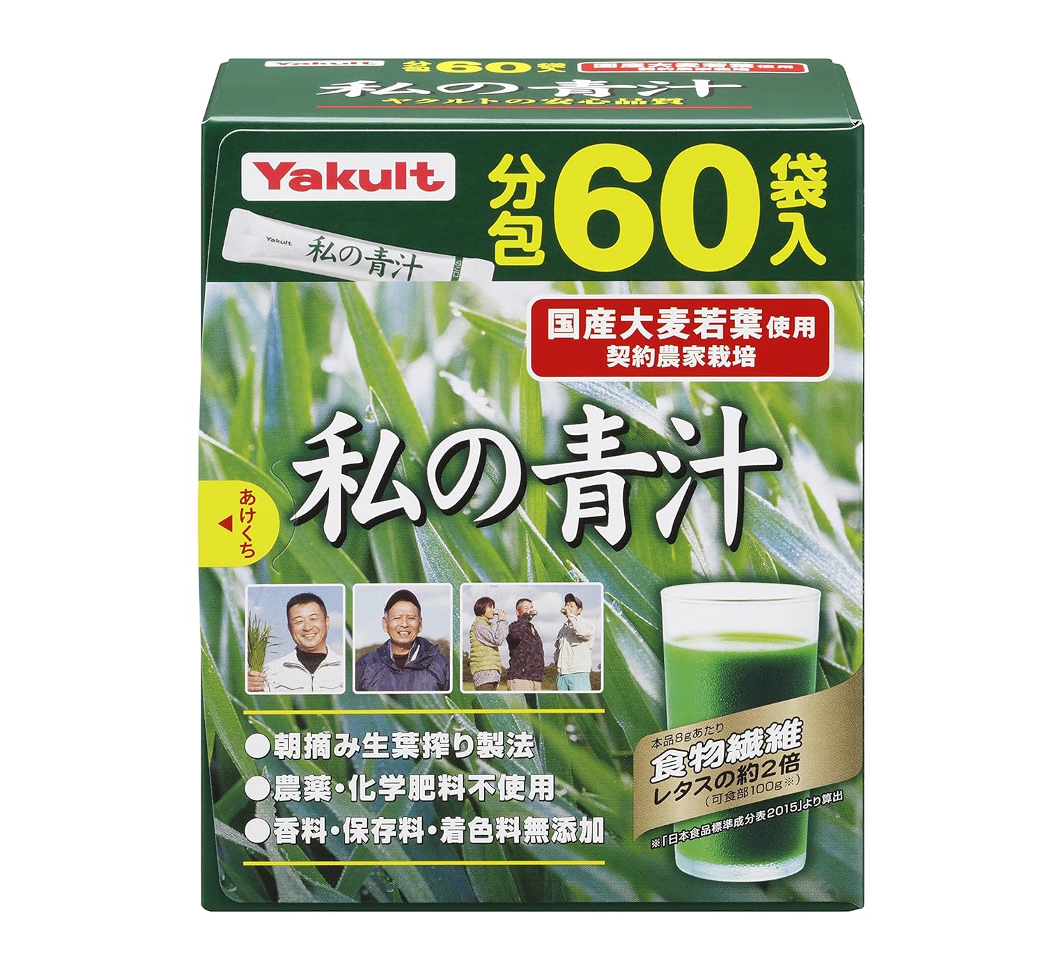 原産国 : 日本原材料 : 大麦若葉エキス、水溶性食物繊維、デキストリン栄養成分:【8g当たり】 熱量:24kcal、たんぱく質:0.9g、脂質:0.2g、炭水化物:6.0g、糖質:3.3g、食物繊維:2.7g、食塩相当量:0.09g、ビタミンK:91μg、葉酸:40μg、鉄:0.7mg、カルシウム:13mg、カリウム:269mg、マグネシウム:7mg、β-カロテン:800μg、ポリフェノール:52mg、ルテイン:1.5mg内容量 : 60包