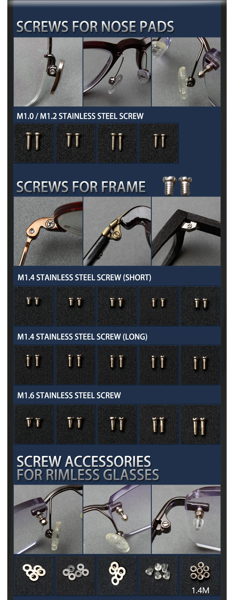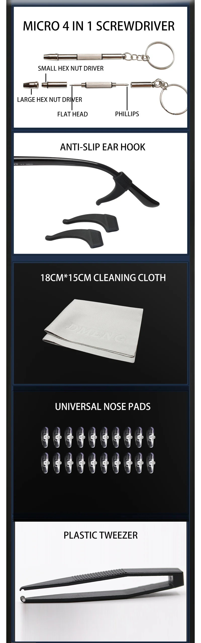 Included Components: Screws, Nose Pads, Screwdriver, Tweezers, Cleaning Cloth