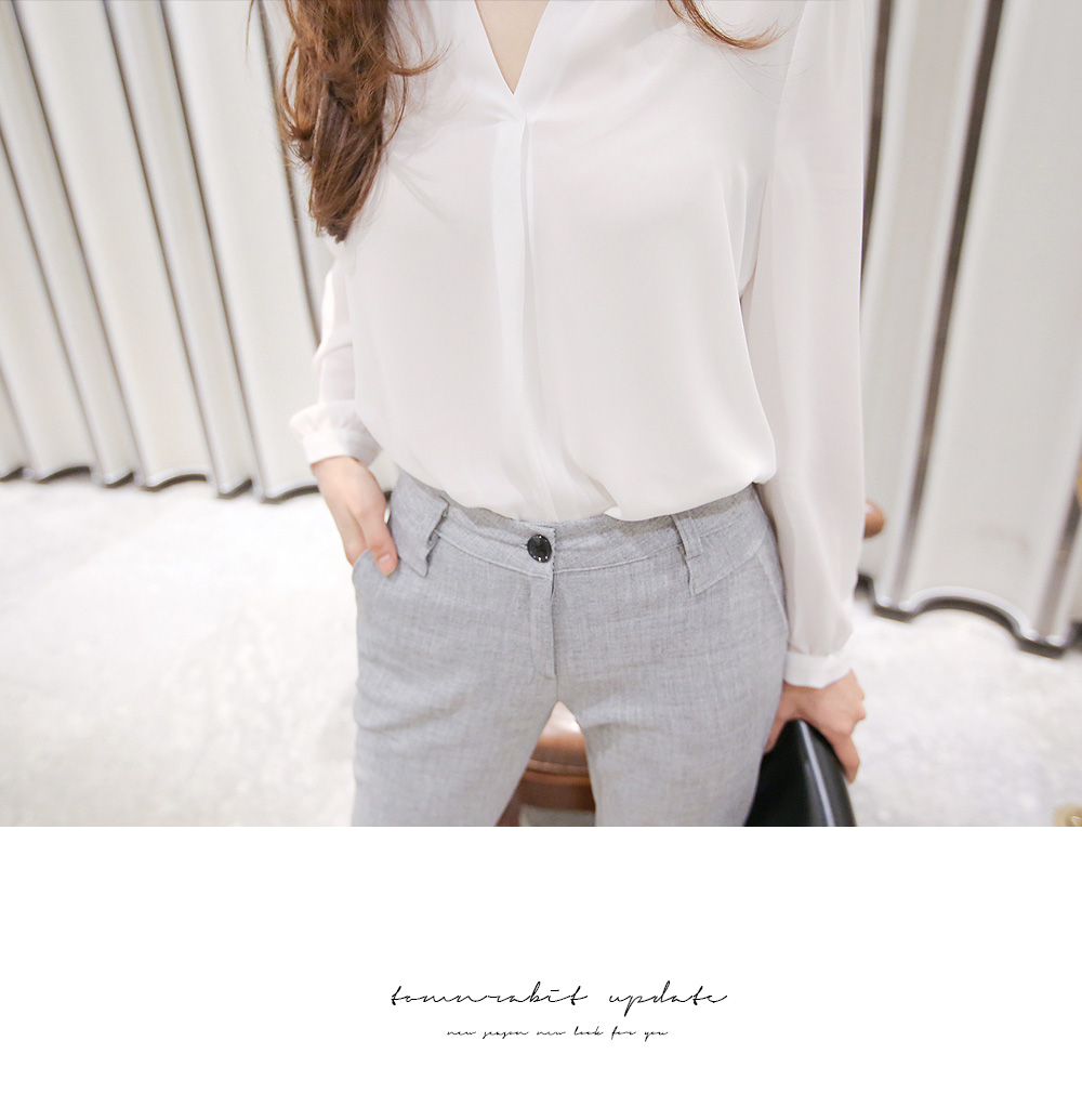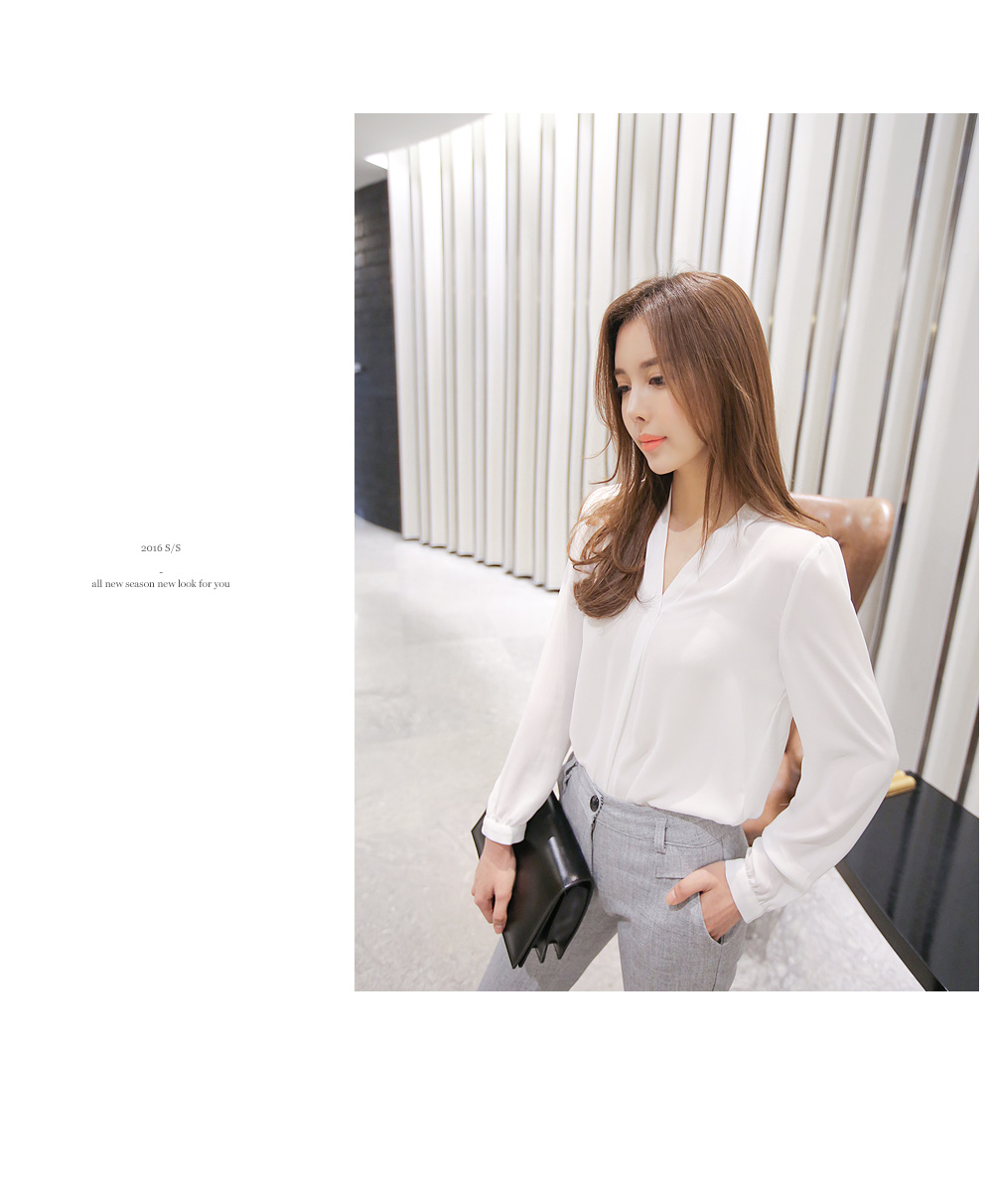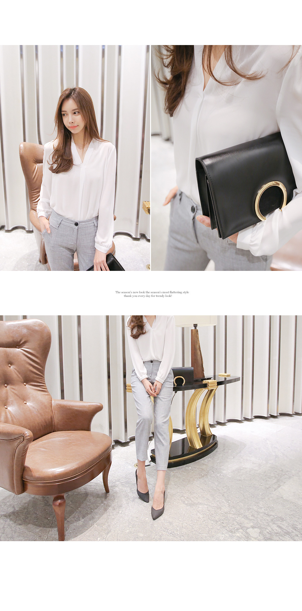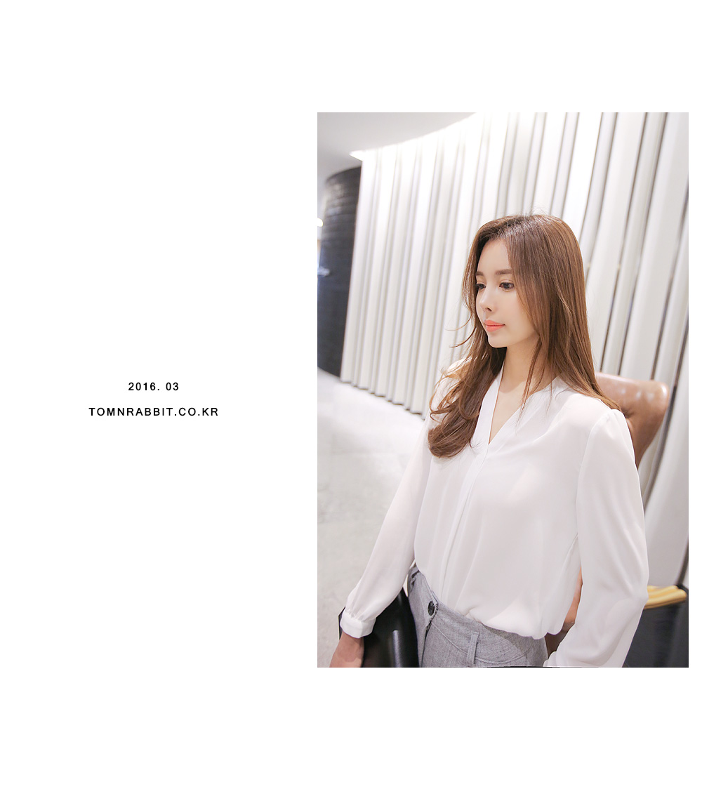 실키한 촉감의 블라우스를 소개해요.부담스럽지 않은 브이넥으로목선과 얼굴 라인을 돋보이게 연출해주구요.군더더기 없는 베이직한 디자인으로모던하면서 깔끔한 라인을 자랑하는 아이에요.스커트나 슬랙스팬츠등과 매치해깔끔하고 세련되게오피스룩,세미정장으로 입어주셔도 좋답니다.매치하기 쉬운 화이트,블랙 2가지컬러로구성되었으니 상세컷 확인후 굿 초이스 해주세요~