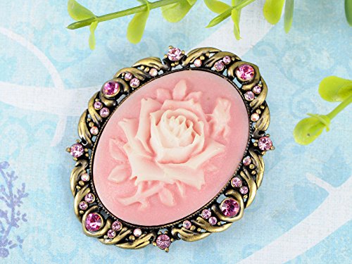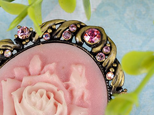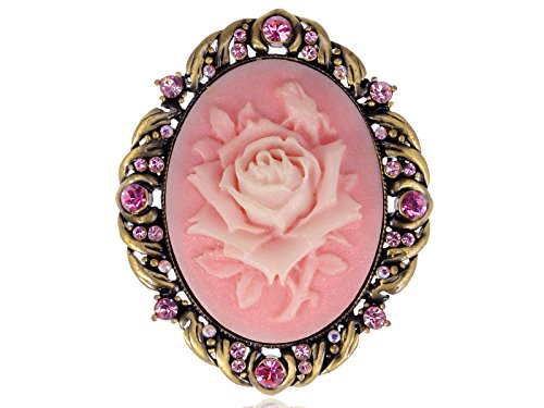 Brass-golden framed rose flower cameo brooch. The frame is matchingly adorned with rose color Swarovski crystals.