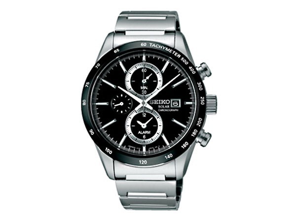 ソーラー、10気圧防水、メイド・イン・ジャパン、テレメーターつき、アラーム機能(ワンタイムアラーム)、ストップウオッチ機能(1/5秒計測 60分計)、カラー:ブラック(文字盤)、シルバー(ベルト)