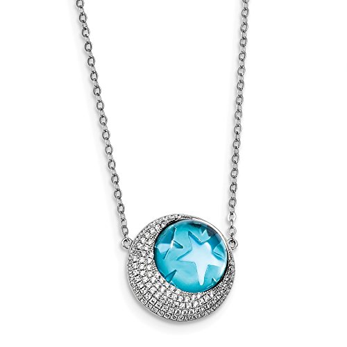 Sterling Silver Rhodium-plate Blue Glass & CZ Cubic Zirconia Moon/Stars 2in Ext Necklace Chain 16" - with Secure Lobster Lock Clasp (0.8mm)