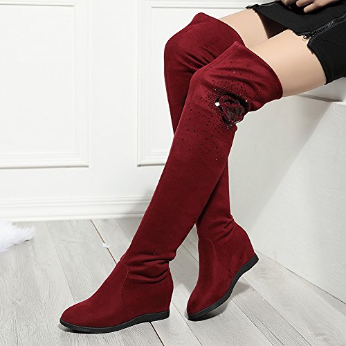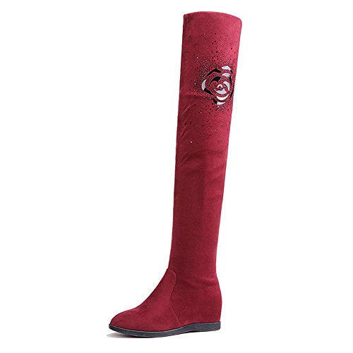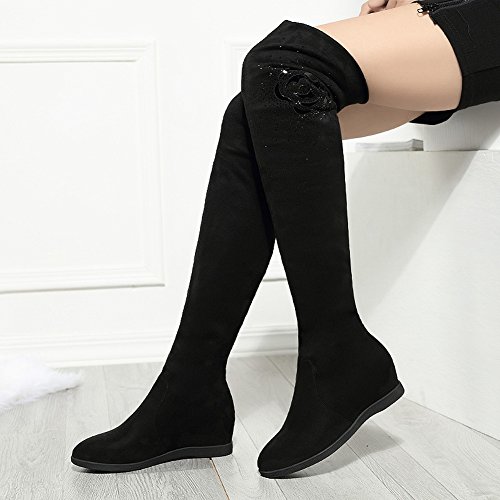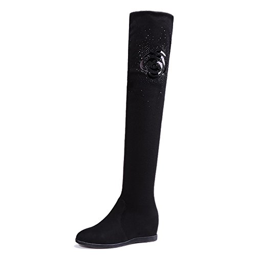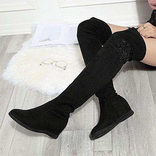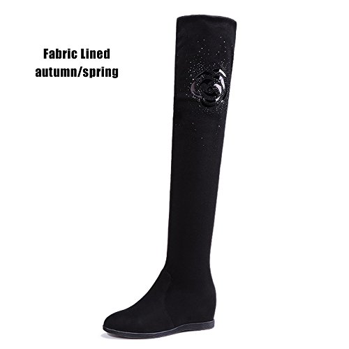 Binding : Apparel Product Description Be warm and stunning with these hidden wedge over the knee boots! Featuring better stretchy faux suede for easier to fit ,flexible easy slip on closure,super hand-stitching and finished with grad pattern fabric lined for spring/autumn Classic black color can match with all outfit.The measurements of stretchy thigh high boots: 0.39 inches platform, 0.59 inches back heel, 1.37 inches hidden wedge heel,13.77 inches adjustable opening circumference,as well as a very comfortable insole. Pair a shirt dress, slitted skirt, a swing dress or a sweater dress mini-skirt, shorts or a dress skinny pants or jeans, a sweater with your favorite platform wedge thigh high boots, add some accessory and you will have super stylish combination without harassment perfect for this season! Fashion stretchy above the knee boots is suitable for all occasins,soffice work,shopping,party,dating,dinner. From dress to jeans and everything in between ,it will make you be the center of attention,also perfect to Thanksgiving, Birthday or Christmas gift for mother,daugther,girlfriend,wife. Size Chart US Size 5.5 B (M) = Heel to Toe 8 7/8 inch(22.5cm) = China Size 35 US Size 6 B(M) = Heel to Toe 9 inch(23cm) = China Size 36 US Size 6.5 B (M) = Heel to Toe 9 1/4 inch(23.5cm) = China Size 37 US Size 7 B (M) = Heel to Toe 9 1/2 inch(24cm) = China Size 38 US Size 7.5 B(M) = Heel to Toe 9 5/8 inch(24.5cm) = China Size 39 US Size 8 B (M) = Heel to Toe 9 7/8 inch(25cm) = China Size 40 0