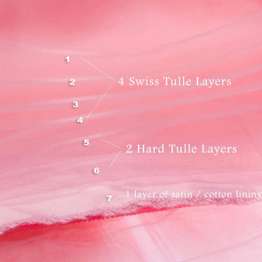 Material:?6 Layers of swiss?tulle ( hard tulle )?+ 1 layer of satin / cotton?lining =?7 layers in total