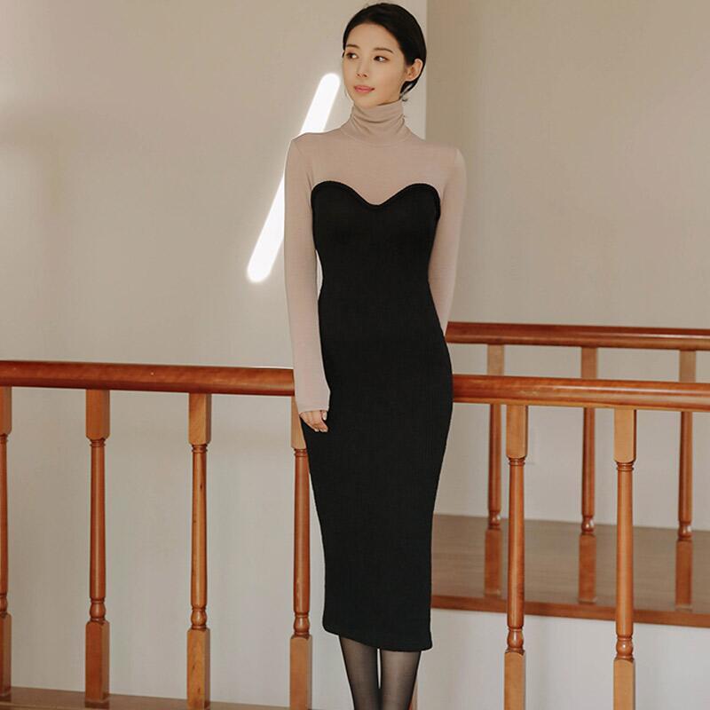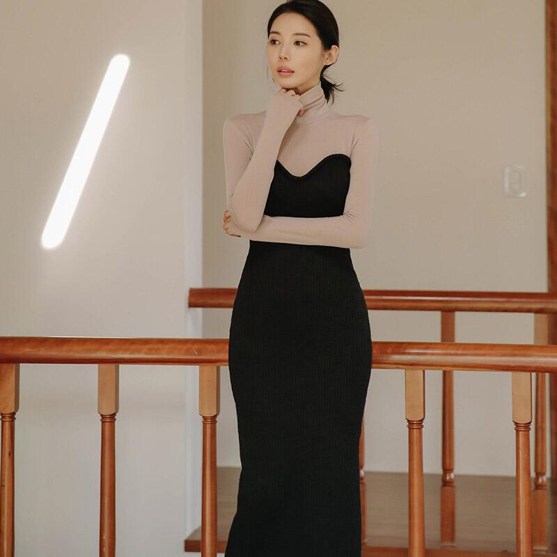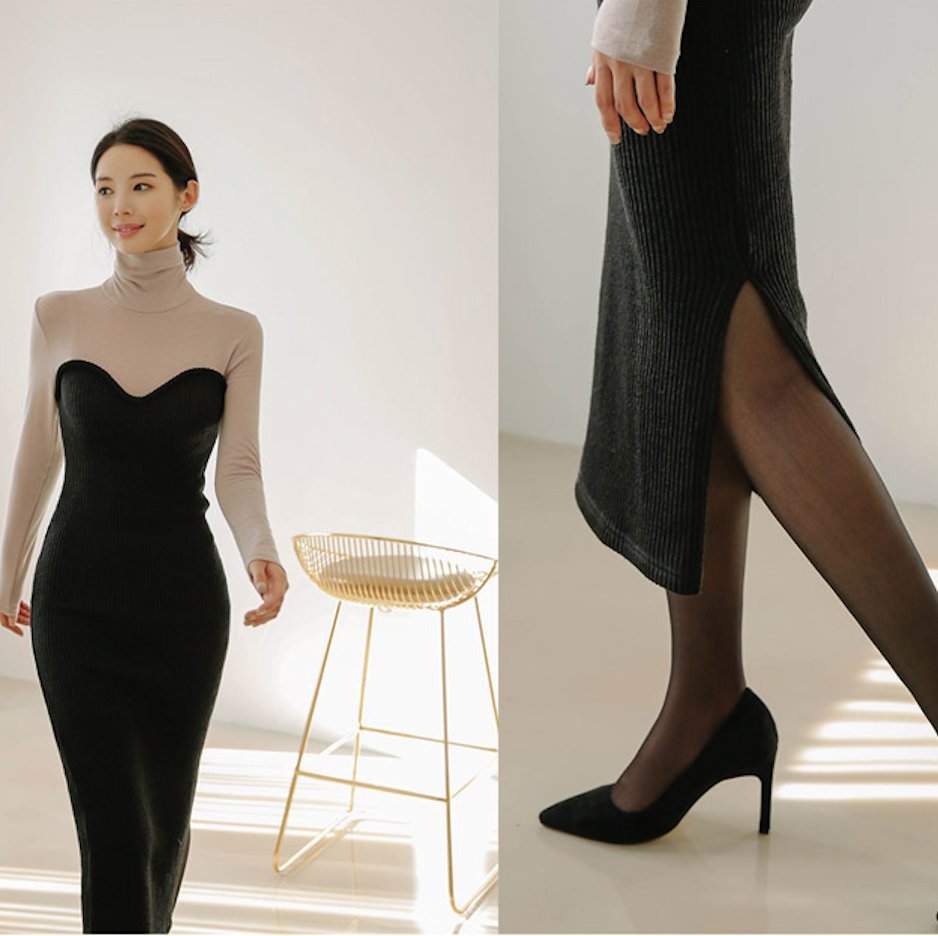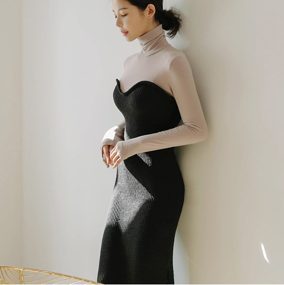 バイカラー タートル リブ ニット ワンピースドレス デート スリット モード お呼ばれ 女子会 通勤 秋冬