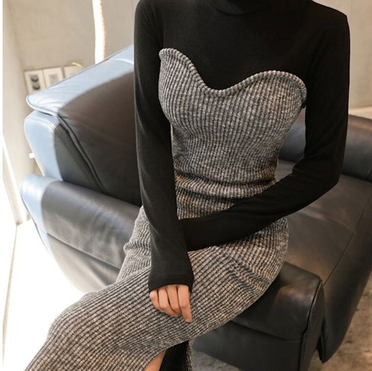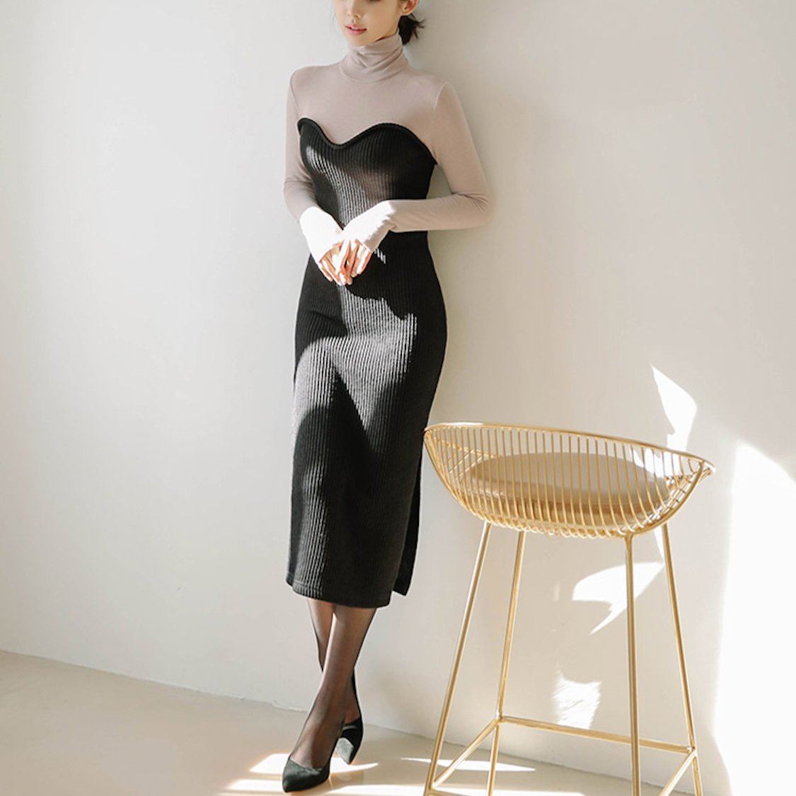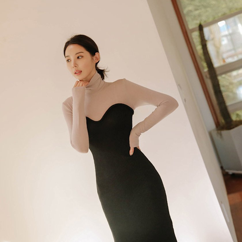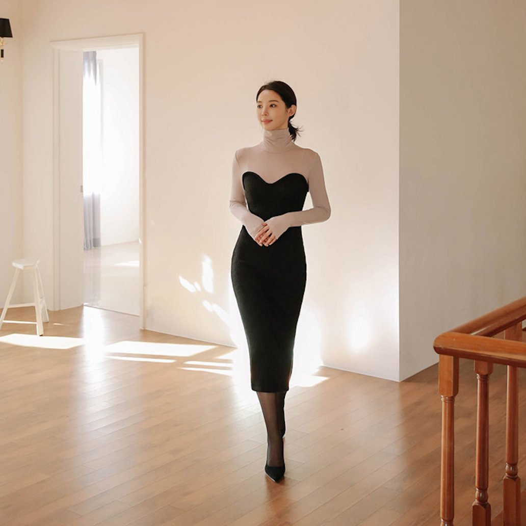 バイカラー タートル リブ ニット ワンピースドレス デート スリット モード お呼ばれ 女子会 通勤 秋冬