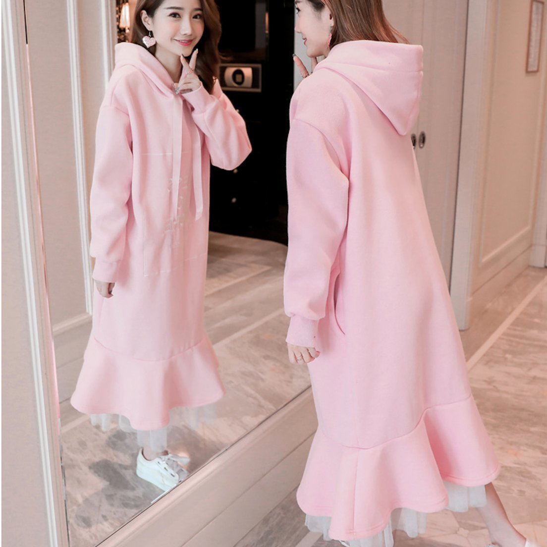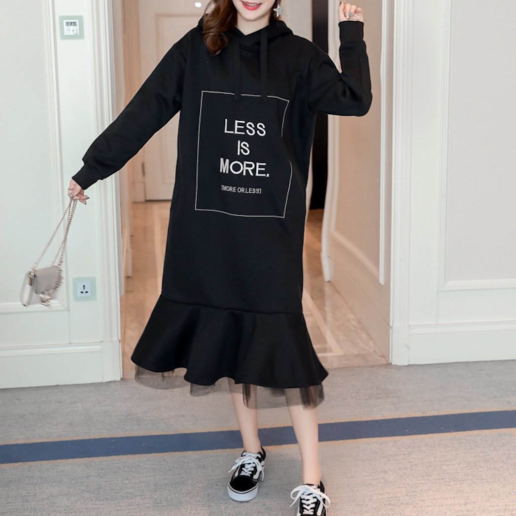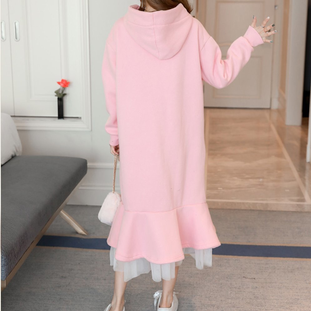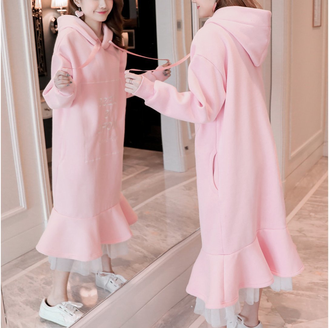 裏起毛 フード付 異素材 リボン ロング ワンピース ガーリー ミモレ丈 レイヤード ゆったり プルオーバー 秋冬 カジュアル フェミニン