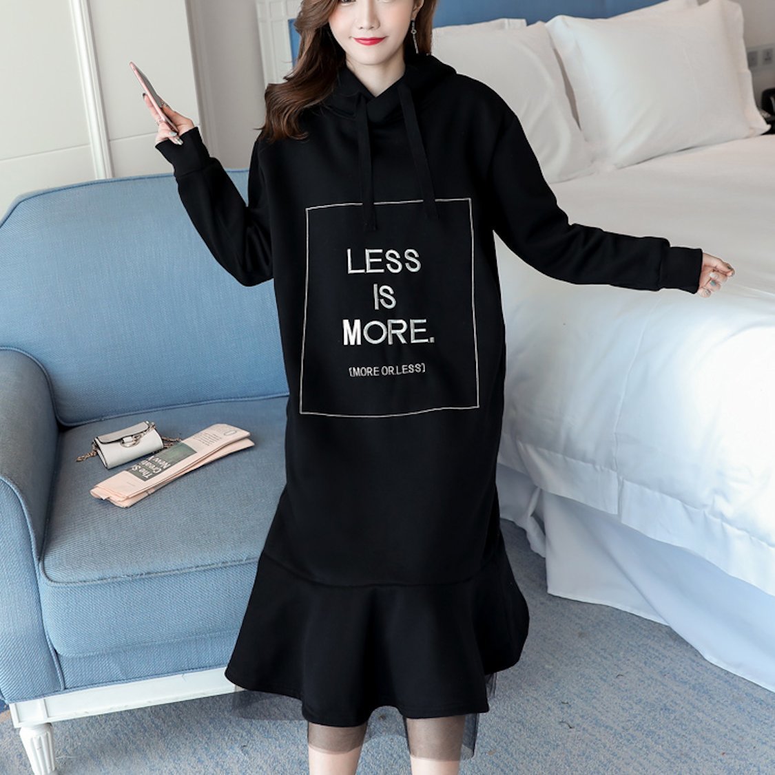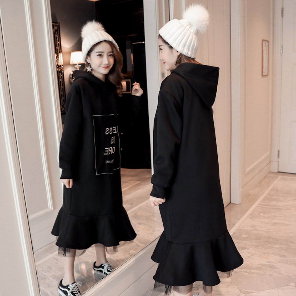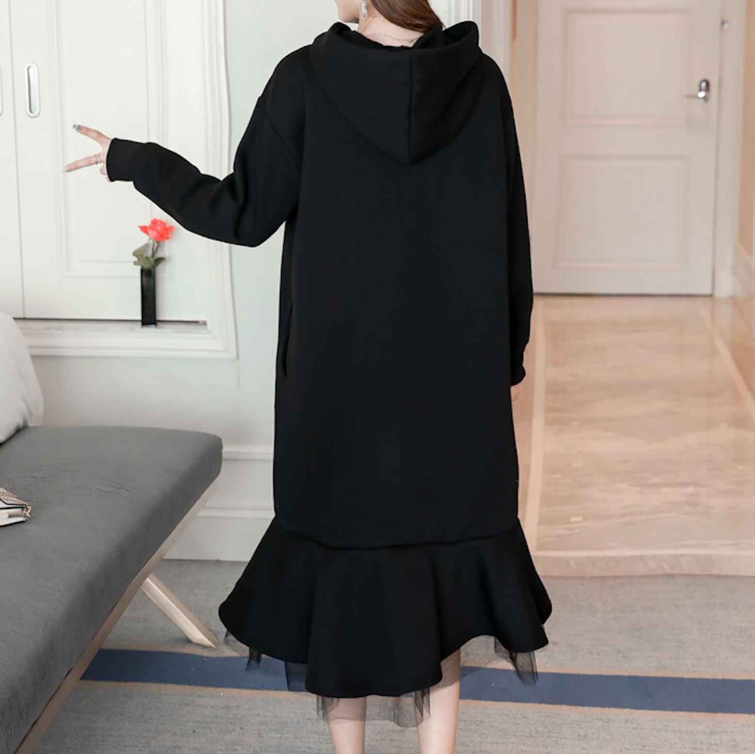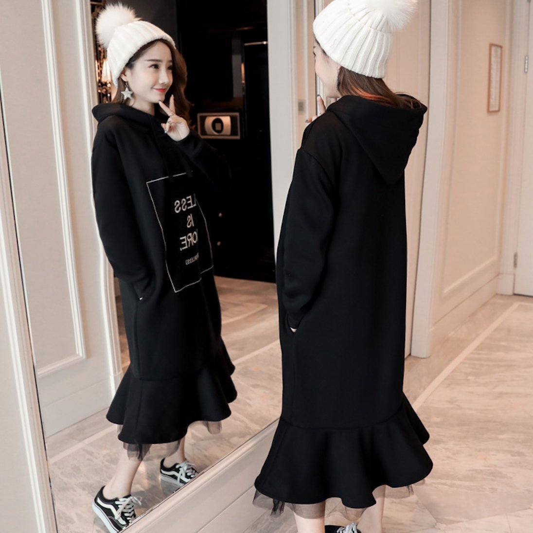 裏起毛 フード付 異素材 リボン ロング ワンピース ガーリー ミモレ丈 レイヤード ゆったり プルオーバー 秋冬 カジュアル フェミニン