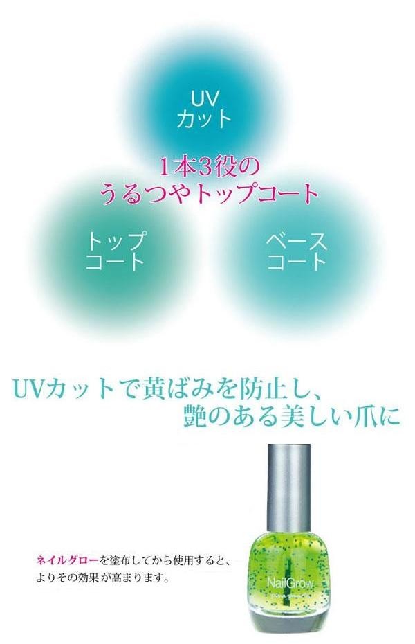 | 爪のツヤ出し、色素沈着の防止に♪UVカットで黄ばみ防止!!別売りのネイルグロー塗布後に本商品を使用すると、より効果を高めます。 |