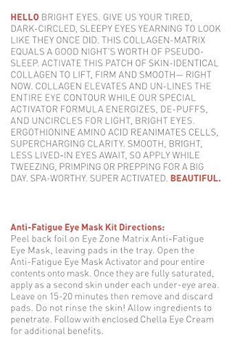 Give us your tired, dark-circled, sleepy eyes yearning to look like they once did. This collagen-matrix equals a good nights worth of pseudo-sleep. Activate this patch of skin-identical collagen to lift, firm and smooth right now. Collagen elevates and un-lines the entire eye contour while our special activator formula energizes, de-puffs, and un-circles for light, bright eyes. Ergothionine amino acid reanimates cells, supercharging clarity. Each Kit comes with a 1.5 ml sample of Chella's Eye Cream to complete the pampering experience! Smooth, bright, less lived-in eyes await, so apply while tweezing, primping or prepping for a big day. Spa-worthy. Super activated.Feature