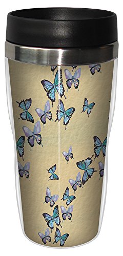 Tree-Free Greetings strives to use the most eco friendly materials and processes possible. Printed and assembled in the USA, the Tree-Free Greetings 16-Ounce Sip 'N Go Stainless Lined Travel Mug is vibrantly printed with hard to find Shell Rummel butterfly themed art and is great for everyday use. It is reusable, therefore eliminating any disposable paper or Styrofoam cup waste. BPA free and Proposition 65 compliant, this beautiful and durable tumbler is stainless steel lined, resists condensation and holds 16 ounces of your favorite hot or cold beverage. To preserve the quality of your tumbler, hand washing is required. The 16-Ounce Sip 'N Go Stainless Lined Travel Mug makes the perfect gift or souvenir. Save trees and spread joy. Buy a Tree-Free earth-friendly gift today.Feature