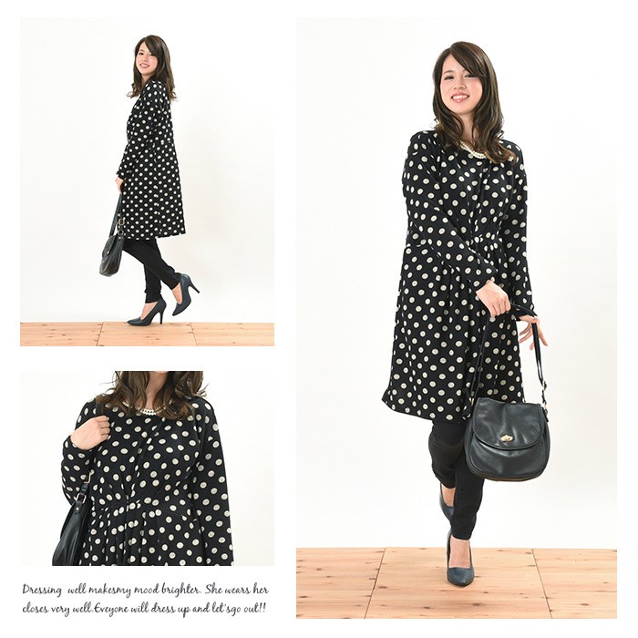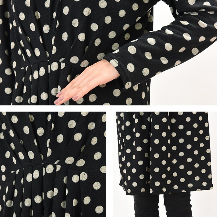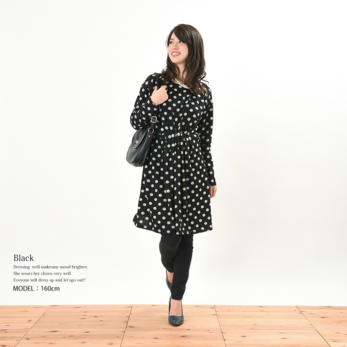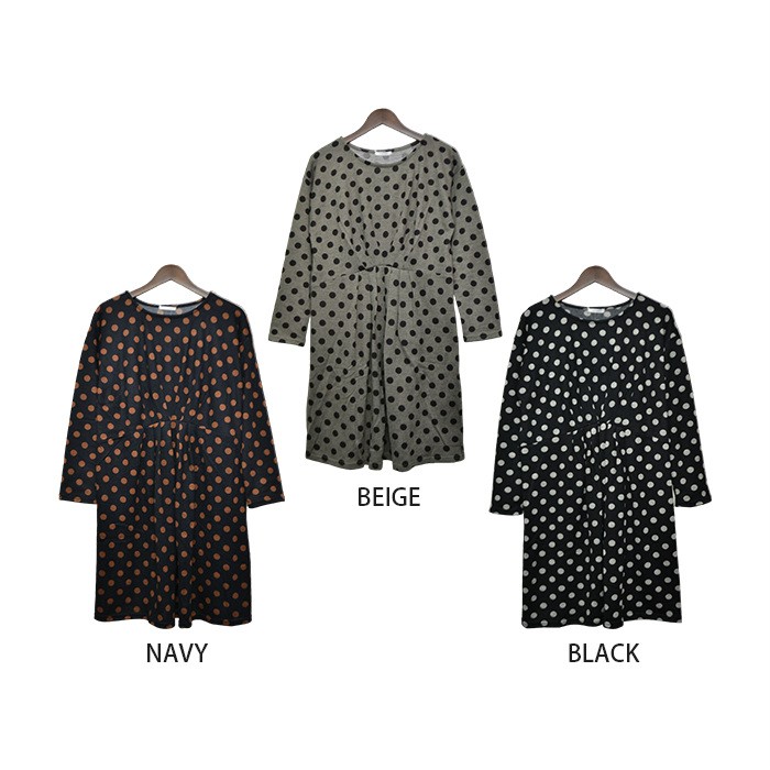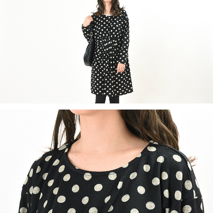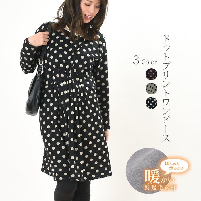 表面はふんわりとした触り心地、内側は起毛でふんわりあったかい、これからの時期にピッタリのワンピースです。シンプルかつ人気の高いドット柄は、着回しがしやすく幅広い年齢層の方に大人気です。ウエスト位置にはたっぷりとタックが入っていて、ウエストの細身効果も抜群です♪全体的にゆったりとしたシルエットなので、着心地楽ちんで体型カバーもしっかりできます♪Mサイズ Lサイズ