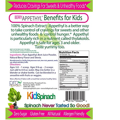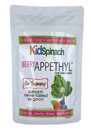 -. Binding : Health and Beauty -. Brand : ProSpinach Appethyl -. EAN : 0853147006042 -. Feature : 100% Extract of Spinach with a gritty texture and an all-natural berry flavor. / Scientific Study lost 51% more weight with Appethyl / Made of Pure Appethyl discovered at Lund University in Sweden / Scientific Study reduced cravings for sweets and unhealthy foods up to 95% / Manufactured in the USA - -. IsAdultProduct : 0 -. Label : Living Ecology -. Manufacturer : Living Ecology -. MPN : KidSpinach Appethyl Berry 90g -. PackageQuantity : 1 -. PartNumber : KidSpinach Appethyl Berry 90g -. ProductGroup : Health and Beauty -. ProductTypeName : HEALTH_PERSONAL_CARE -. Publisher : Living Ecology -. Size : 90 Grams -. Studio : Living Ecology -. Title : Appethyl, KidSpinach Berry Drink, Delicious! 90g Appetite Suppressant -. UPC : 853147006042