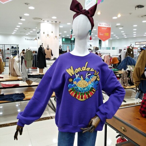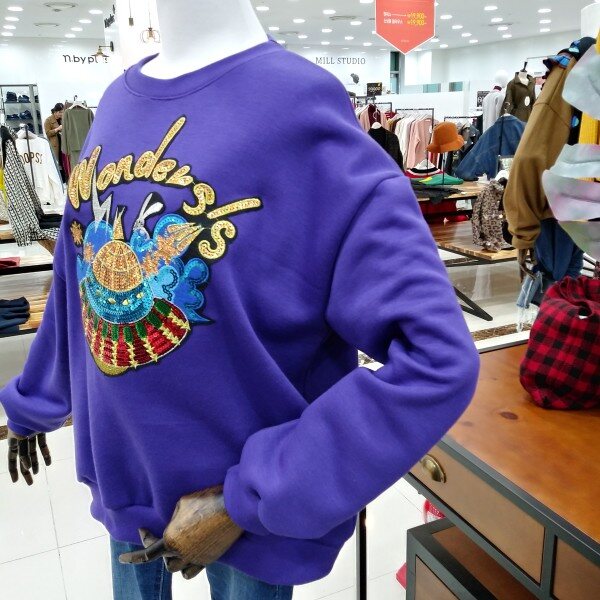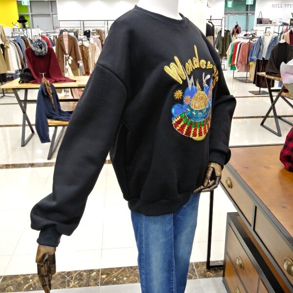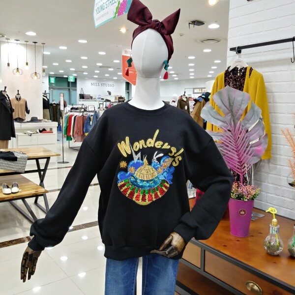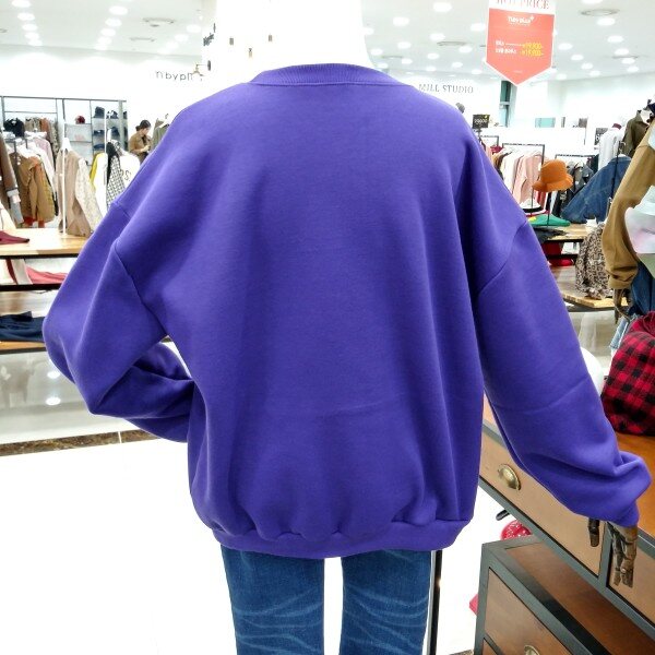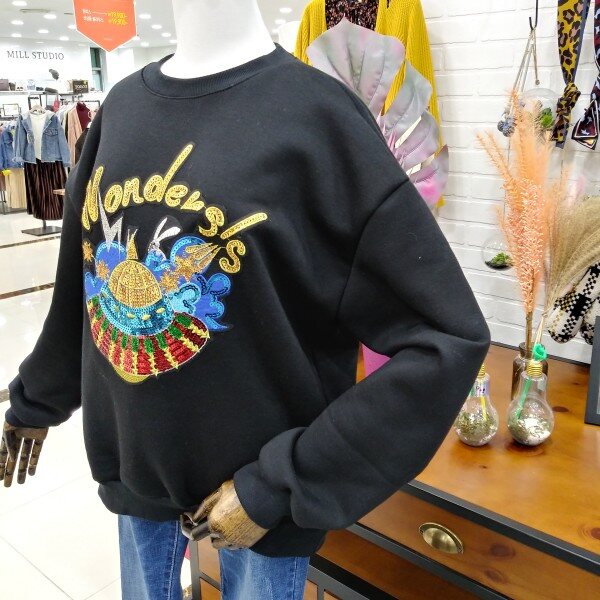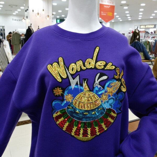 루즈한 핏으로 넉넉한 품라인에 화사한 스팽글로 장식이 들어가있어 캐주얼하면서도 포인트 이너티로 입기좋은 기모맨투맨 티이에요