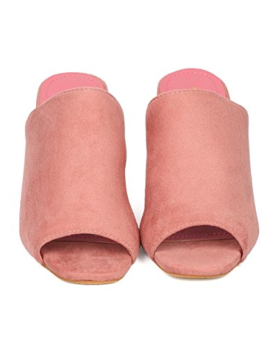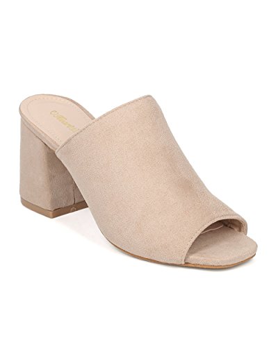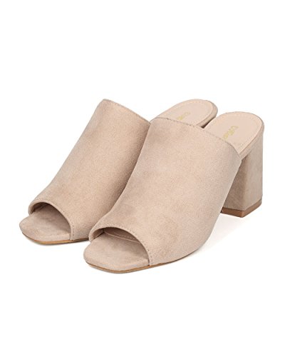 Product DescriptionThese faux suede mules are made with a peep toe, covered vamp, and chunky heel. Also designed with an easy to slip on design.0