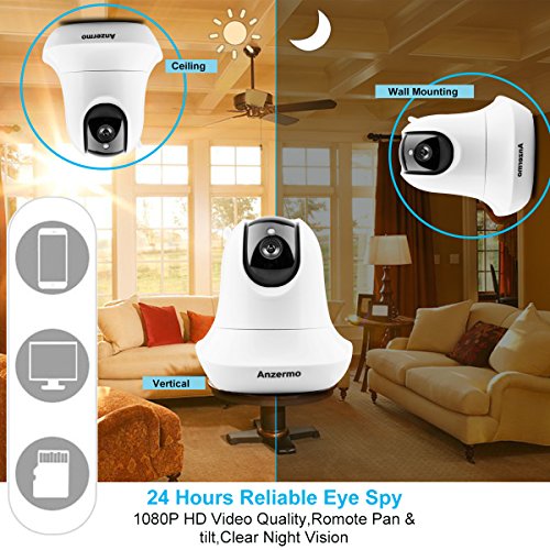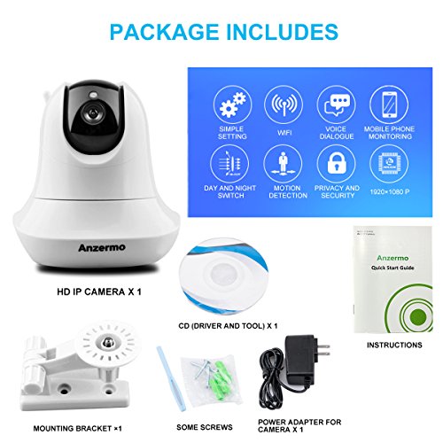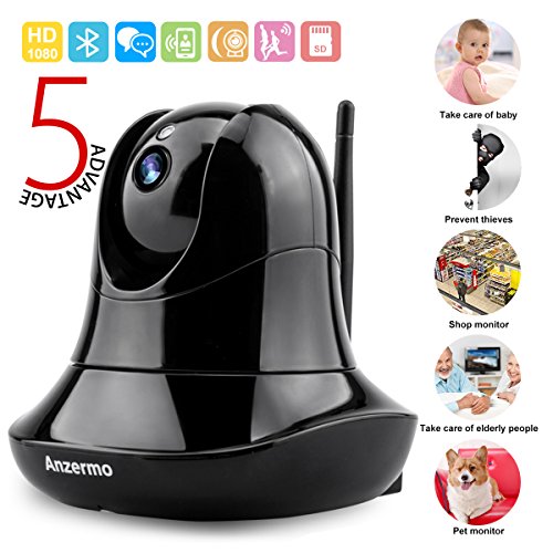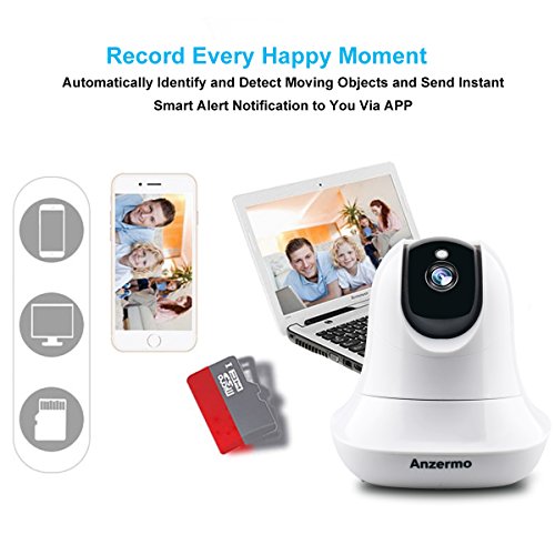 Anzermo P2P(Plug and Play) Megapixel Wireless IP Camera features high definition 1920×1080P video resolution, h.264 video compression, Micro-SD card support (up to 64GB), two-way audio, Wi-Fi capability, pan/tilt, remote internet viewing, motion detection, night vision. In addition, it is Smartphone compatible (iPhone, Android - app required) as well as viewable over the internet using standard browsers on IE or Mac (Safari only). The camera functions well as a Smartphone baby, pet or elderly parent monitor or as part of a complete home/office security system with remote internet monitoring ability.