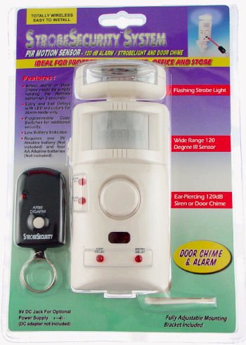- Feature : Wireless and easy to install. / 120dB Alarm with strobe light. / detect motion from up to 30 feet away by120 degree wide / Entry and exit delays with LED indicators for alarm mode only / Comes with one IR remote control
