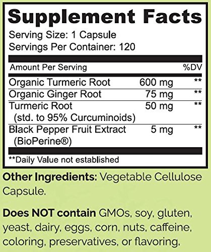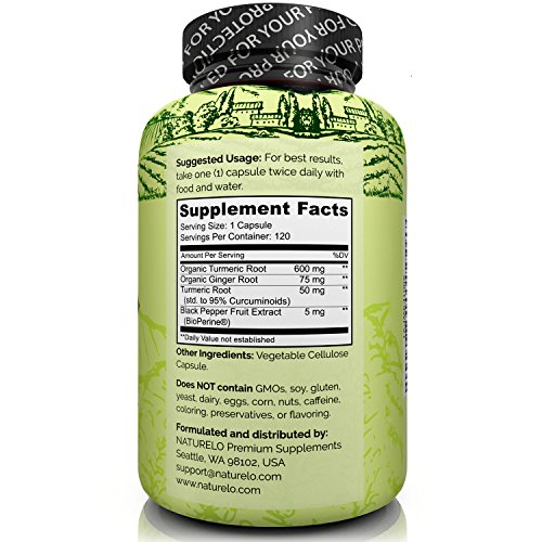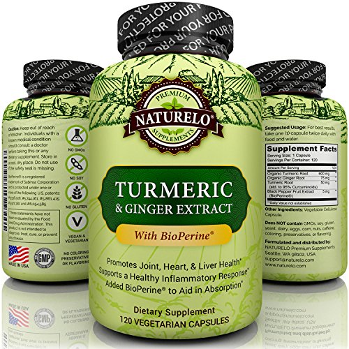-. Feature : HEALING POWER: Turmeric is a Natural Anti Inflammatory Herb that Relieves Joint Pain Related to Rheumatoid Arthritis, Corporal Tunnel & Plantar Fasciitis*. / ENHANCED ABSORPTION: Piperine, a substance found in black pepper fruit extract has been shown to improve the bioavailability of herbs. Ginger has also been shown to help absorption. Our Organic Turmeric supplement with Ginger and BioPerine may provide as much as 2000x better absorption than consuming turmeric alone. / TOP QUALITY, HIGH POTENCY COMPLEX: Each capsule of the NATURELO Turmeric supplement contains 650 mg of Pure Organic Turmeric extract standardized to 95% Curcuminoids, along with 75 mg of Organic Ginger root powder, and 5 mg of BioPerine for enhanced absorption and bioavailability. / NO ADDITIVES OR FILLERS: Our all natural and non-GMO Organic Turmeric supplement with ginger and black pepper comes in vegan-friendly, gluten-free, vegetarian capsules that are FREE of gluten, soy, milk, egg, shellfish, corn, wheat, and peanuts.