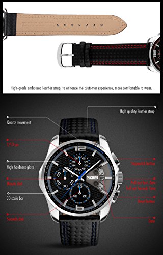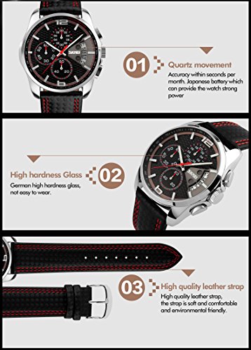 -. Feature : BUSINESS CASUAL AND SPORT DESIGN: design to combine business casual and sport with classic black dial in silver case featuring with chronograph sub-dials, date window at 3 o'clock, analog display and luminous hour/minute hands/hour marks, easy to read at dark / DURABLE AND COMFORT LEATHER BAND STRAP: Key scratch resistant which attributes to its protective mineral crystal dial window, along with super durable, wearing comfortable experience for its genuine black red band strap with buckle closure / Precise quartz movement for accurate time keeping, quality materials detail of the watch, packed with cleaning cloth for men, while P.R.Ice is on matched / FASHIONABLE AND LUXARY LOOKING STYLE: 42mm hardness mineral case with embedded rod shape hands in face of watch, effortlessly elegant and modern, suitable for every occasion / WATER RESISTANT TO 30 M / 99 FEET: In general, these watches will withstand small splashes of water but should not be worn while washing the hands or submerging the hands in water