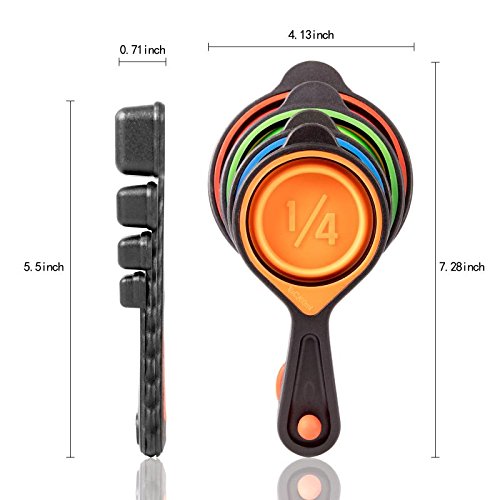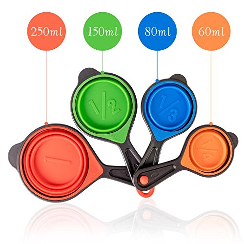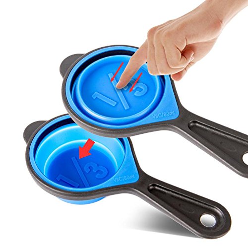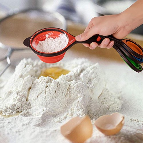 - EASY CLEANING AND EASY STORAGE - Cups and Spoons are dishwasher friendly. When not in use. They fit in any drawer or cupboard. The measuring cups are collapsible so they can stack flat on each other, thus saving valuable space