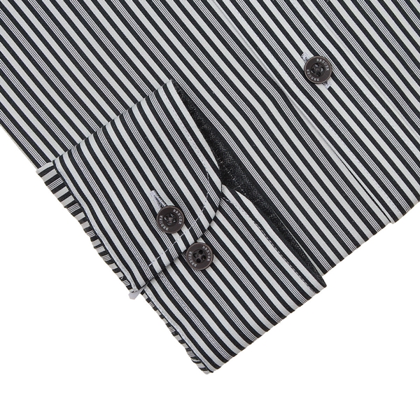 트윌 조직의 네이비 멀티스트라이프 프린트 원단으로 아시안,커프스안쪽 배색 디자인과