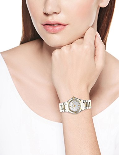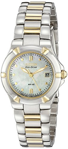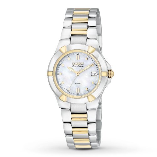 Amazon.com Featuring a mother-of-pearl dial, the Citizen Women's Eco Drive Two-Tone Watch is a casual, everyday timepiece with special touches. The luminescent dial shimmers with every movement and displays slender gold-tone hands without numeral hour indexes for an elegant, minimalist look. The polished stainless steel case, crown, and small round bezel are integrated smoothly for an overall sleek, refined style. Ideal for a woman who prefers a traditional, precision-crafted watch, the classic bracelet is stainless steel with gold-toned accents. The mineral crystal is scratch resistant for added durability. The Citizen Women's Eco Drive Gold-Tone Watch is powered by Japanese quartz movement and fueled by natural and artificial light so it doesn't require a battery. Plus, it's water resistant to 100 meters (330 feet). 0