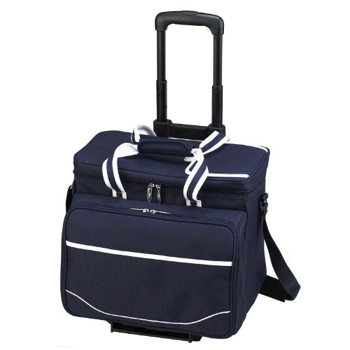 Studio : Picnic at Ascot Publisher : Picnic at Ascot Binding : Kitchen Product Description Fully equipped picnic cooler for four with removable wheeled cart. Unique, divided cooler compartment with separate sections for wine and food. Easy drink access panel in the lid. The cooler is leak proof so may used with ice to extend cooling. Includes combination corkscrew, cheese knife, acrylic wine glasses, coordinating melamine plates and napkins, stainless steel flatware. Includes hand grip and adjustable shoulder strap, extra front pocket. Wheeled cart has retractable handle and is simple to remove when not needed. 600D polycanvas. Designed and Assembled in the USA. Lifetime Warranty.
