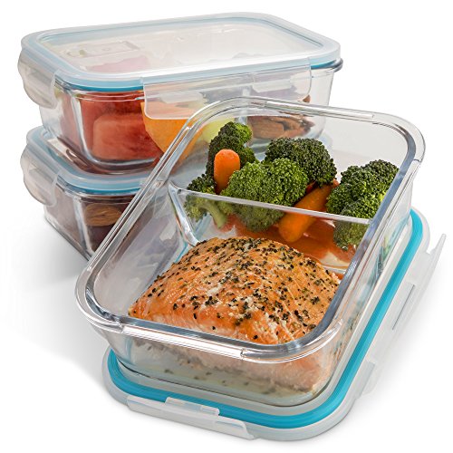 Glass Meal Prep Containers, Set of 3 - Meal Portion Control Container by Lofte - BPA-Free, Food Safe Lunch Organizers with Dividers for Packed Lunches or Saving Leftovers - Storage for Foods with Lids