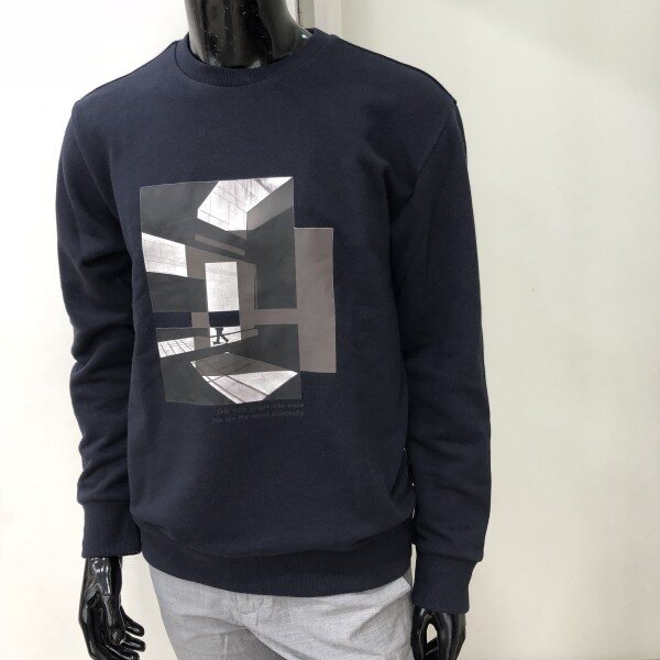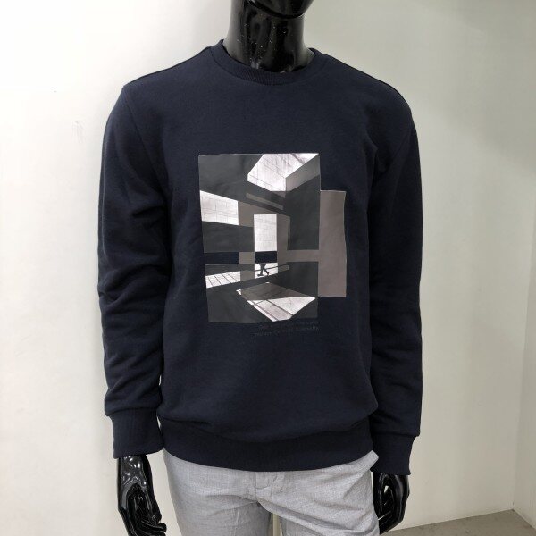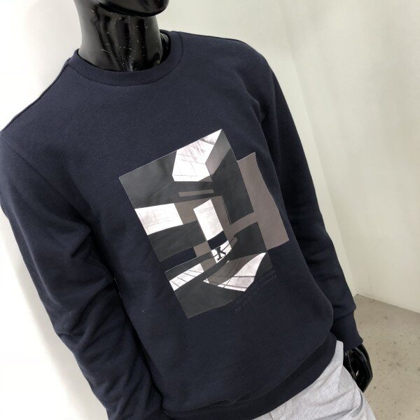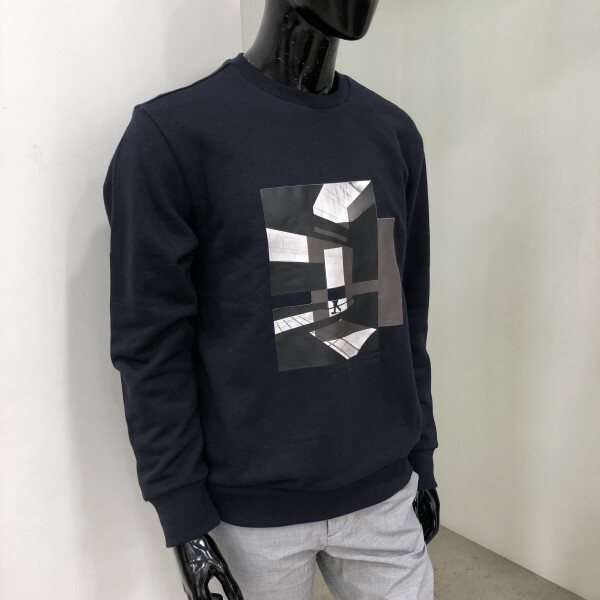 2018 F/W 신상 베이직핏 맨투맨 입니다. 중앙에 기하학적인 느낌을 모티브로 한 전사프린트로 포인트를 준 스타일리쉬한 느낌의 티셔츠입니다.