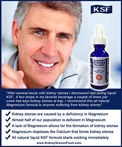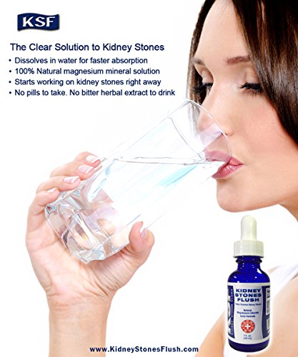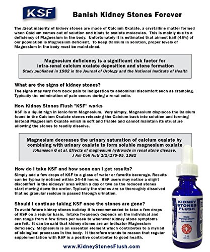 Kidney Stones Flush "KSF" is an all-natural concentrated solution containing ionic Magnesium Chloride. KSF is a clear solution which readily dissolves in water and is more quickly absorbed by the body than herbal formulas for faster results. Over 85% of kidney stones are composed of Calcium Oxalate. The Magnesium in KSF helps displace the Calcium found in kidney stones immediately after ingestion helping render the stones completely soluble. It is estimated that almost half of the US population (48%) is Magnesium deficient. When the natural balance between Calcium and Magnesium is not maintained, excess Calcium comes out of solution and binds to Oxalate molecules forming Calcium Oxalate. Taking KSF frequently helps maintain proper Cal-Mag balance, helping inhibit the formation of kidney stones. Proper supplementation with Magnesium is also essential for a healthy body as Magnesium is a key nutrient in a myriad of essential biochemical processes in the body.Feature
